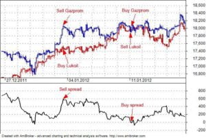 Below is a clear example of spread trading. On the upper chart we can see futures on “Gazprom” (blue) and “Lukoil” (red) shares, on the bottom – spread chart of these two instruments. When prices diverge (“Lukoil” is cheaper), we sell the spread, thus we sell “Gazprom” and buy “Lukoil”. After the prices get close to each other (note the spread going to 0), we close our basket position getting about 600 points of profit.
